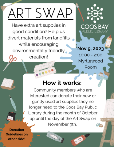 How it works: Community members who are interested can donate their new or gently used art supplies they no longer need to the Coos Bay Public Library during the month of October and through the day of the Art Swap on November 9th. On the day of the Art Swap, come to our big meeting room and browse to see what art supplies you might be interested in! You can take up to as much as you donate (or just a couple items if you don't have anything to donate).