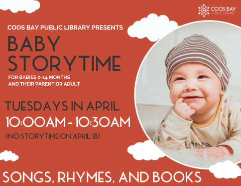 Tuesdays this April, babies and a parent or caregiver are invited to a special baby storytime series. Songs, rhymes, and books geared towards kids 0-14 months.
