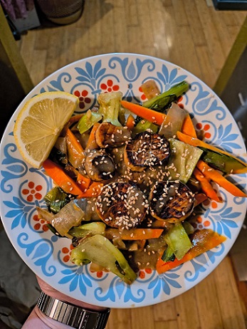In the pan you cooked the veggies in, heat 1 TBS oil on medium heat. When hot, add in the scallops in a single layer, not touching each other. Let cook about 3-5 minutes, or until the scallop is browned and a bit crusted. Flip, and let cook until the other side looks the same. This is the time when I try the tester mushroom cap.