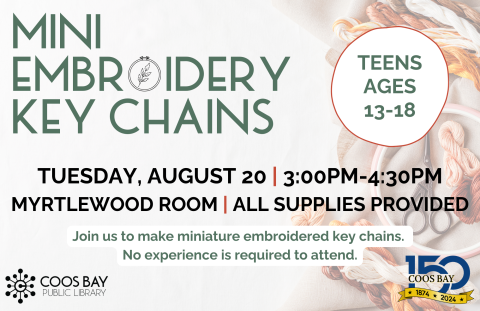 Join us to create miniature embroidered key chains. No experience required and all supplies will be provided.