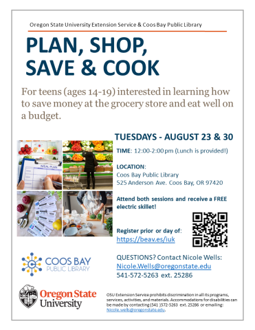 Teens 14-19 are invited to learn how to eat well on a budget and enjoy a free lunch in a practical cooking class offered through OSU. Lunch provided each day. Learn how to make a vegetable and beef skillet meal August 23 and a chicken, broccoli and cheese skillet meal on August 30. Teens will talk through how to meal plan and will receive ingredients for the recipes served to take home and re-create for their families. Parents or caregivers are welcome to attend with their teens. All participants will receive a free electric skillet after attending both sessions. Pre-registration is recommended but not required.