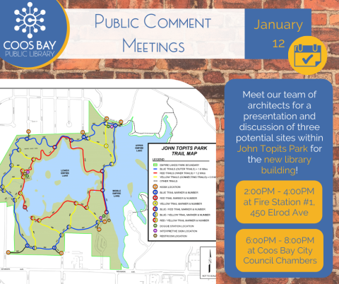 Join us at one of two meetings Wednesday, January 12, to hear from our architects and state your preference between three potential sites for the new library building within John Topits Park!Why is the library moving? Check out our video on the topic: https://youtu.be/GM-B5Tg9plU The 2-4pm meeting is at the Fire Hall on Elrod. The 6-8 meeting is at City Hall Council Chambers. If you would like to attend virtually-