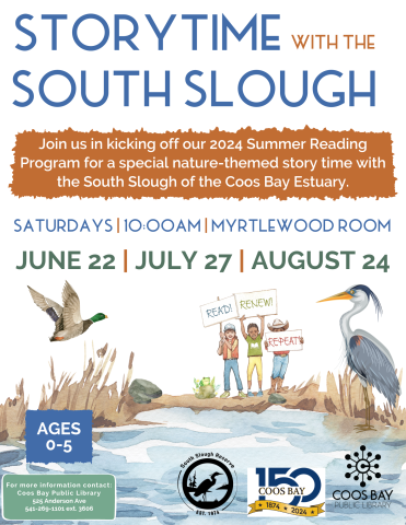 The South Slough’s popular Tide of the Toddlers program is hitting the road for a special nature themed storytime series. Read, learn, and create a nature craft. Parents or caregivers must attend with their toddler or preschooler. No registration required.