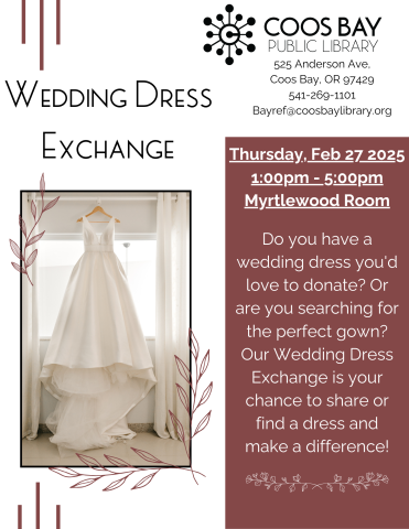 - Donate your new or gently used wedding dress to Coos Bay Public Library during the last week of February.