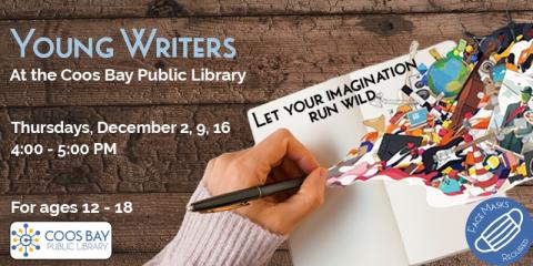 The Young Writers Group will meet at the Coos Bay Public Library from 4:00pm-5:00pm December 2, 9 and 16.  The program is designed for writers ages 12-18 to jumpstart their writing.  Each week, we'll have a writing prompt or game, time to write independently, and an opportunity to share your work with the group.