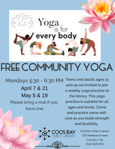 This event is in the "Teen" group This event is in the "Adult" group Community Yoga Saturday, February 28, 2026 at 9:00am - 10:00am Myrtlewood Room at Library Program Type: Health & Wellness Age Group: Teen, Adult Who is this class for? Beginners and experienced yogis alike! All levels are welcome. Teens and Adults.What to Bring: Comfortable clothing, yoga mat, water bottle View Details This event is in the "Teen" group This event is in the "Adult" group Feb 28 2026 Sat Community Yoga 9:00am–10:00am Library Library Branch: Library Room: Myrtlewood Room Age Group: Teen, Adult Program Type: Health & Wellness Event Details: Who is this class for? Beginners and experienced yogis alike! All levels are welcome. Teens and Adults.What to Bring: Comfortable clothing, yoga mat, water bottle