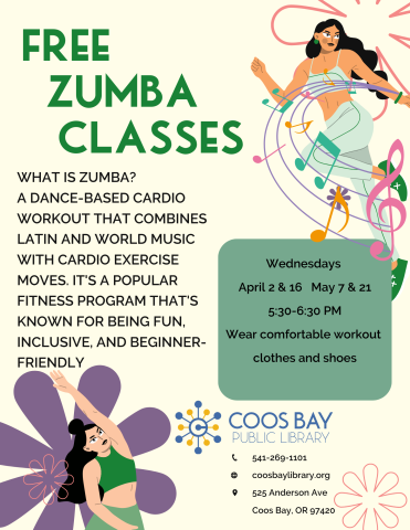 This event is in the "Teen" group This event is in the "Adult" group Community Zumba Wednesday, March 25, 2026 at 5:30pm - 6:30pm Myrtlewood Room at Library Program Type: Health & Wellness Age Group: Teen, Adult View Details This event is in the "Teen" group This event is in the "Adult" group Mar 25 2026 Wed Community Zumba 5:30pm–6:30pm Library Library Branch: Library Room: Myrtlewood Room Age Group: Teen, Adult Program Type: Health & Wellness